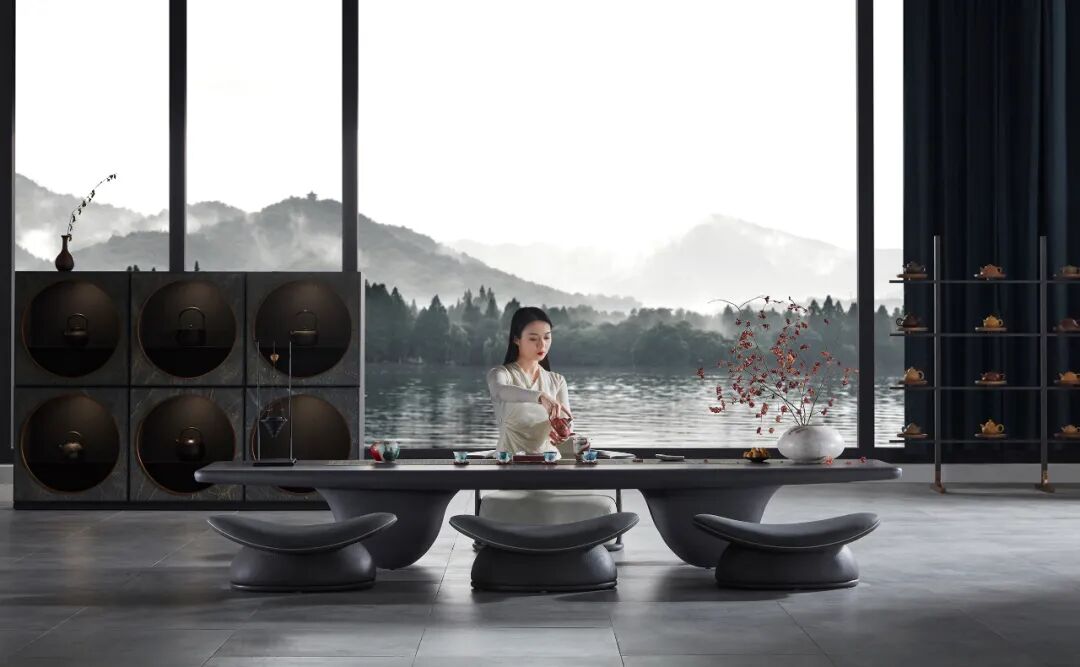 “花家山下流花港,花著鱼身鱼嘬花”,“观鱼系列”灵感源于乾隆下江南游西湖时的描绘西湖十景之一的“花港观鱼”。整个茶桌选用触感极佳的西班牙进口岩板,用鱼的轮廓赋予桌面的形态。在设计上通过灵动的线条、现代材料与色彩的碰撞,将现代摩登风格发挥的淋漓尽致。